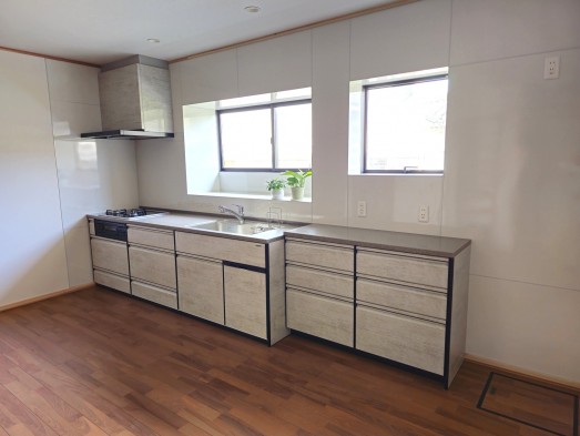 キッチンのカラーとキッチンパネルのカラーがマッチ。シックでお洒落な仕上がりです。間取り変更に伴い、梁などの補強もいたしました。和室二部屋のうちの一つは、天然木のフローリング材で床の貼替。もう一つの和室は念願の物干し兼大容量なウォークインクローゼット。想像以上に